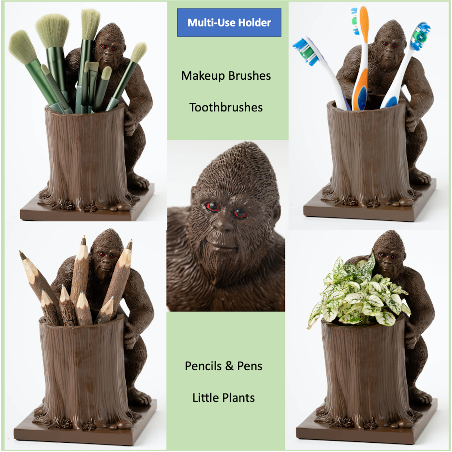 Other eye witness accounts state the bigfoot pen cup holder being used on vanities as a makeup brush holder. The hollow tree is perfect for storing makeup brushes, eye liners, lipsticks, etc. It was also seen in bathrooms as a toothbrush holder for kids and adults.