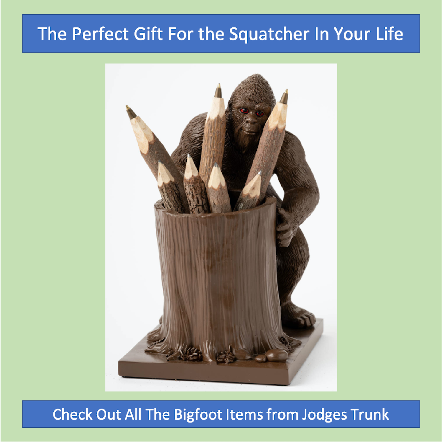 There’s Something on the Vanity – Getting ready for the day just got squatchier. The sasquatch pen stand and pencil cup holder doubles as a cosmetic organizer. The hollow tree is perfect for storing makeup brushes, eye liners, lipsticks, etc. that provide the coverage cryptids need to stay out of sight.